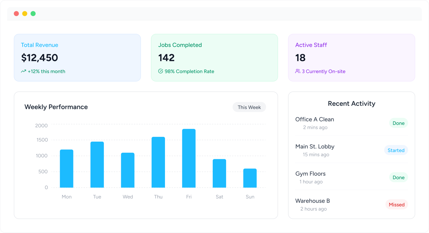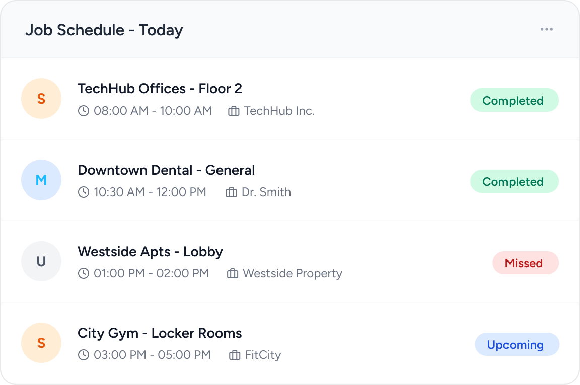 View completed and upcoming cleaning jobs. Spot missed cleans instantly and track recurring schedules.