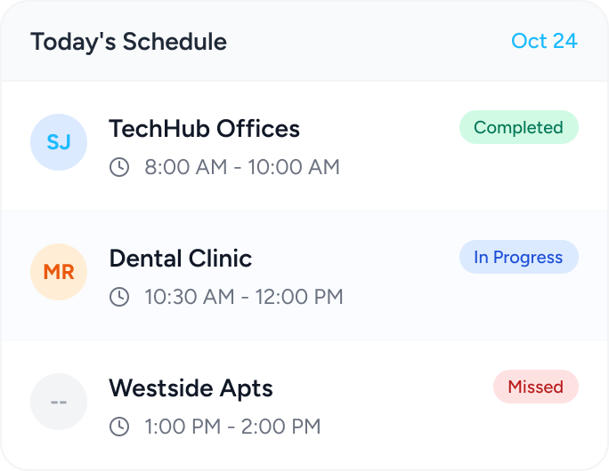 View completed and upcoming cleaning jobs. Spot missed cleans instantly and track recurring schedules.