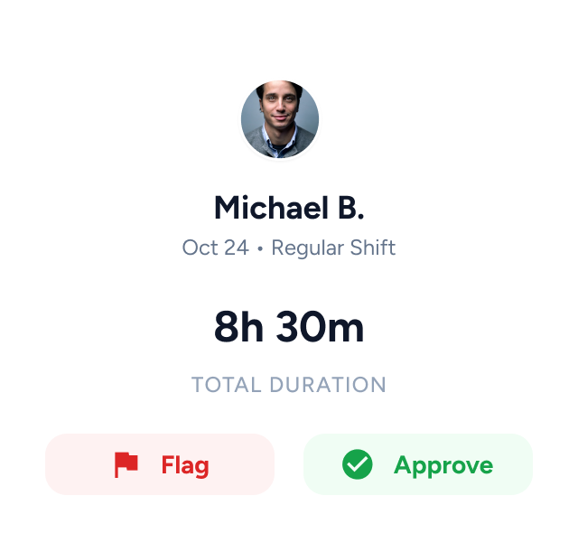 Download payroll-ready CSV or PDF reports in seconds.