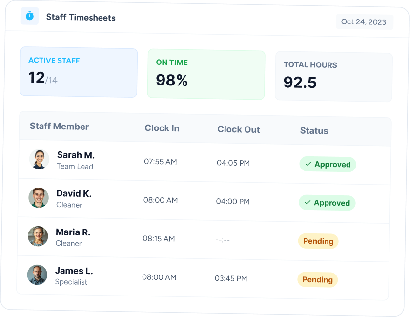 Cleaners use their own phones to track time. Hours are recorded automatically with GPS verification, so you never have to chase down paper timesheets again.